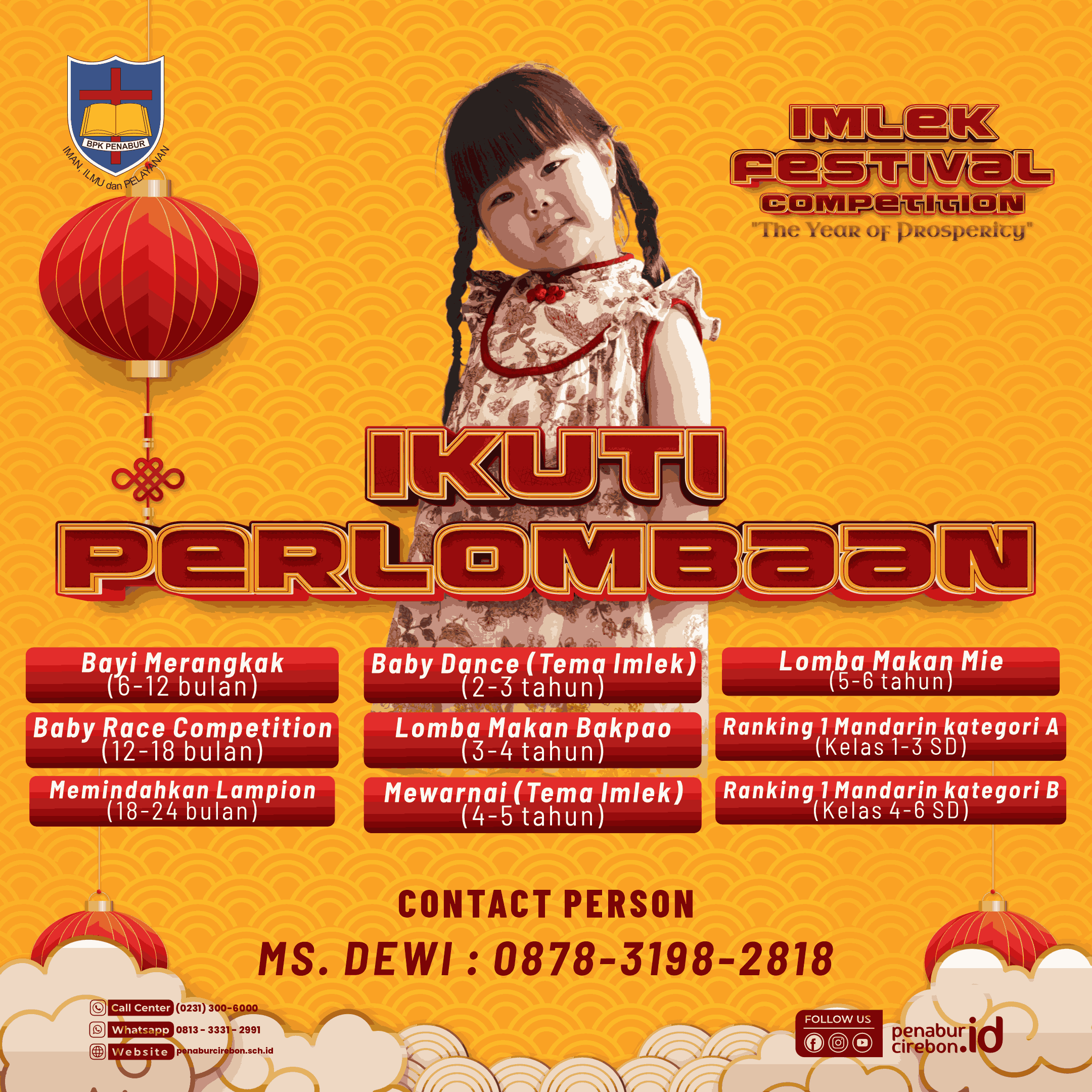 Cirebon, BPK PENABUR – Dalam rangka menyambut hari raya Imlek 2025, BPK PENABUR Cirebon mengadakan Imlek festival Competition “The Year of Prosperity” di Yogya Junction Jl Kartini No 26 Kota Cirebon, pada tanggal 01 Februari 2025, pukul 13.00 hingga selesai. Kegiatan ini sungguh sangat menarik dan meriah karena BPK PENABUR Cirebon akan membagikan ANGPAO SPESIAL PROMOSI PPDB 2025/2026, selain itu juga terdapat berbagai macam perlombaan yang dapat di ikuti seperti bayi merangkak, baby race competition, memindahkan lampion, baby dance (tema imlek), lomba makan bakpao, mewarnai (tema imlek), lomba makan mie, ranking 1 mandarin kategori A, ranking 1 mandarin kategori B. Untuk informasi lomba dapat menghubungi PIC di nomor 0878-9198-2818 (Ms Dewi).